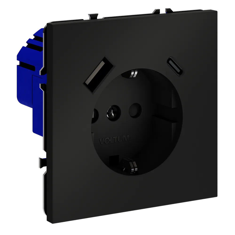 Розетка встраиваемая VOLTUM S70 с заземлением и защитными шторками 16А с USB А+С (черный матовый)