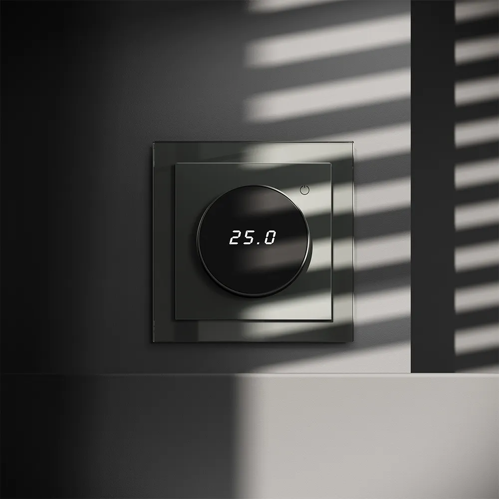 Место установки. Терморегуляторы Voltum предназначены для регулирования температуры электрического теплого пола. Актуальны как в городских квартирах, так и в загородных дачных домах без центрального отопления. Корпус. Дизайн терморегуляторов Voltum сочетается со стилем остальных электрических устройств компании. Они совместимы со всеми рамками. Материал внешних декоративных элементов — поликарбонат. Конструктивные особенности. Терморегуляторы работают с любыми типами теплых полов и рассчитаны на нагрузку до 3500 Вт. Устройства оснащены светодиодной индикацией режима и дисплеем, на котором отображается температура поверхности пола. Красный индикатор — «подача питания на нагревательный кабель (идет процесс нагрева)», отсутствие индикации — «заданная температура достигнута». В течение 15 минут после нагрева терморегулятор переходит в интеллектуальный «спящий режим», уменьшая яркость подсветки цифр и сокращая энергопотребление. Регулировка осуществляется вращением панели управления. Терморегулятор поставляется в комплекте с механизмом из пластиковой накладки и датчиком температуры.